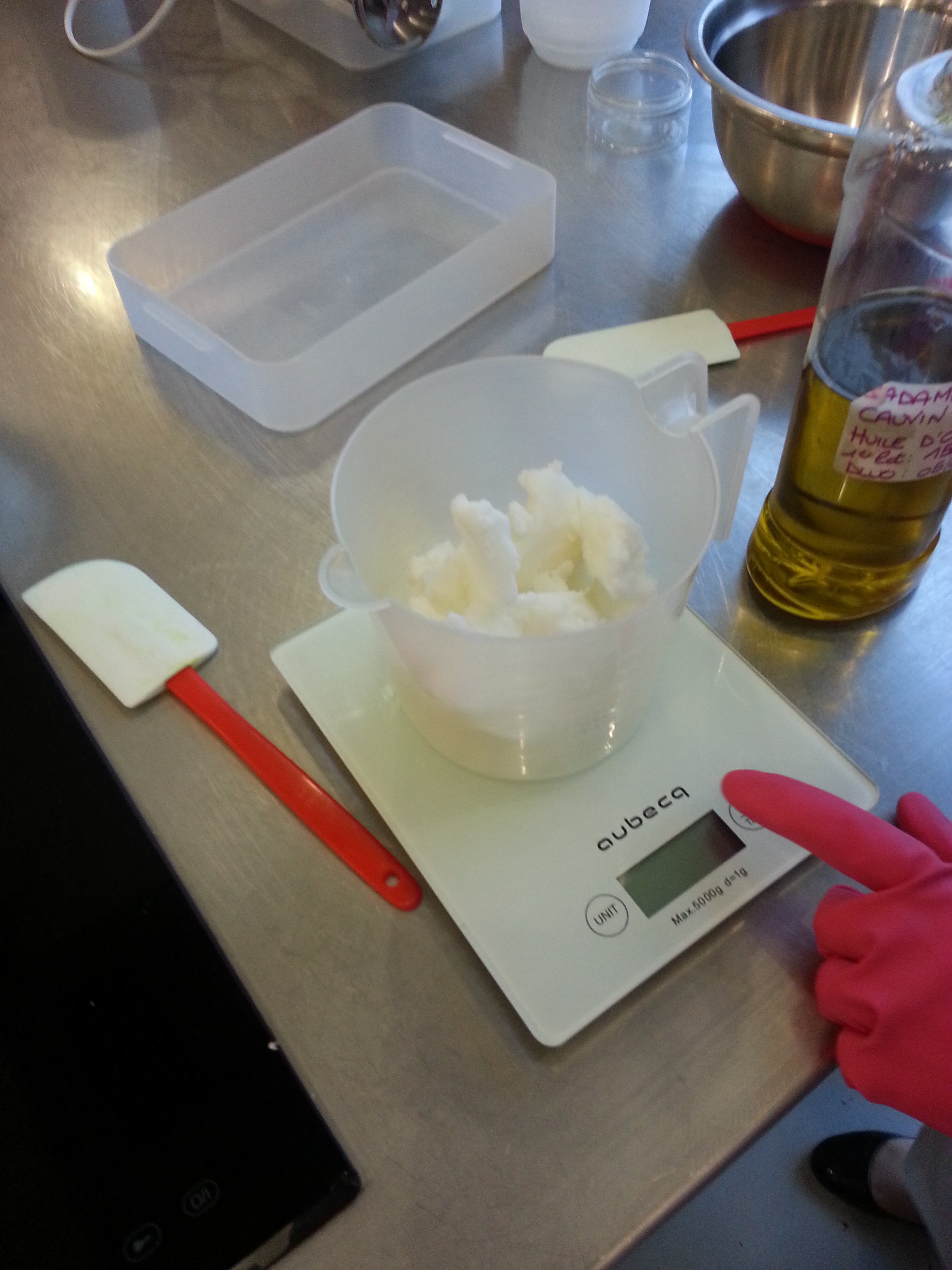 Ensuite nous passons à la partie pratique et là ça ressemble à un cours de cuisine, nous manipulons beurres, huiles, cacao, canelle et autres douceurs. Nous pesons, faisons chauffer, mélangeons, mixons.